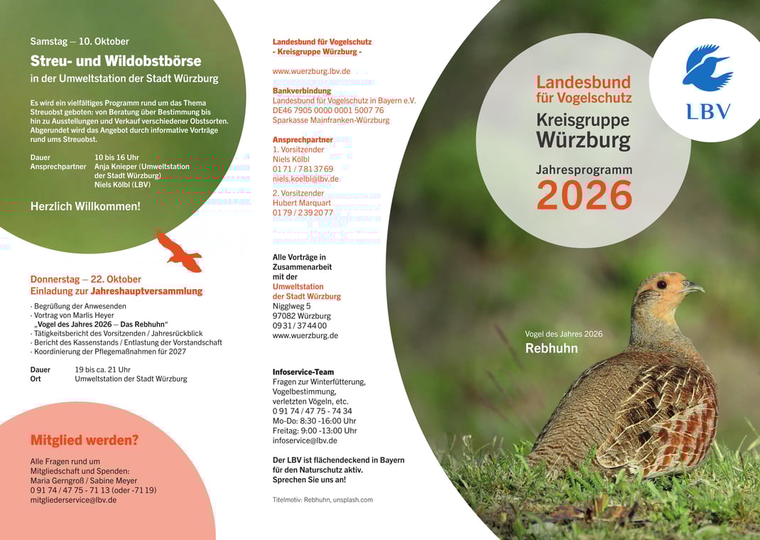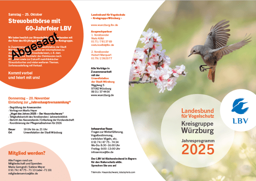 Zum Saisonabschluss möchten wir Sie noch zur Streu- und Wildobstbörse am 10. Oktober und zu einer kleinen Wanderung im Irtenberger Forst am 11. Oktober einladen. Den Abschluß des diesjährigen Jahresprogramms bildet wie immer unsere Jahreshauptversammlung am 22. Oktober in der Umweltstation der Stadt Würzburg.